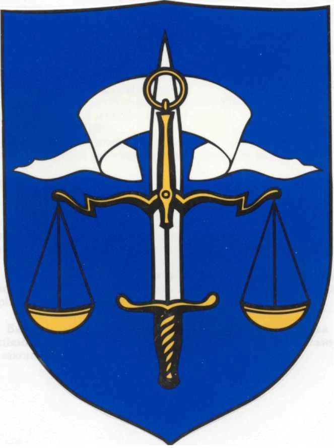 З обох боків емблеми зображено по 1 зеленому листку каштана, кожен із суцвіттям у вигляді піраміди, складеної з білих та золотих трикутників. Ширина лиштви дорівнює 1/8 висоти полотнища. Висота літер дорівнює 1/10 висоти полотнища. З трьох сторін прапор облямований жовтою бахромою. Співвідношення сторін полотнища 11:15.